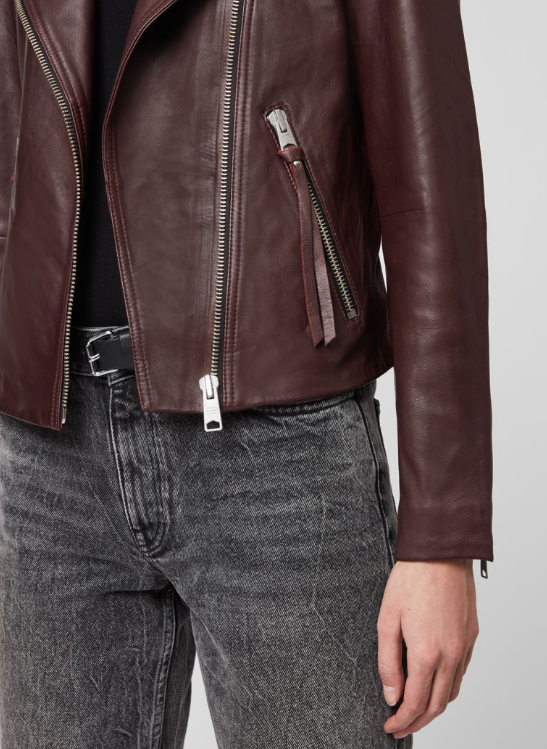 No fuss leathers. The Dalby Biker Jacket is a minimalist design, crafted in a dark raspberry pink hue. Shiny gunmetal trims contrast the smooth leather base.